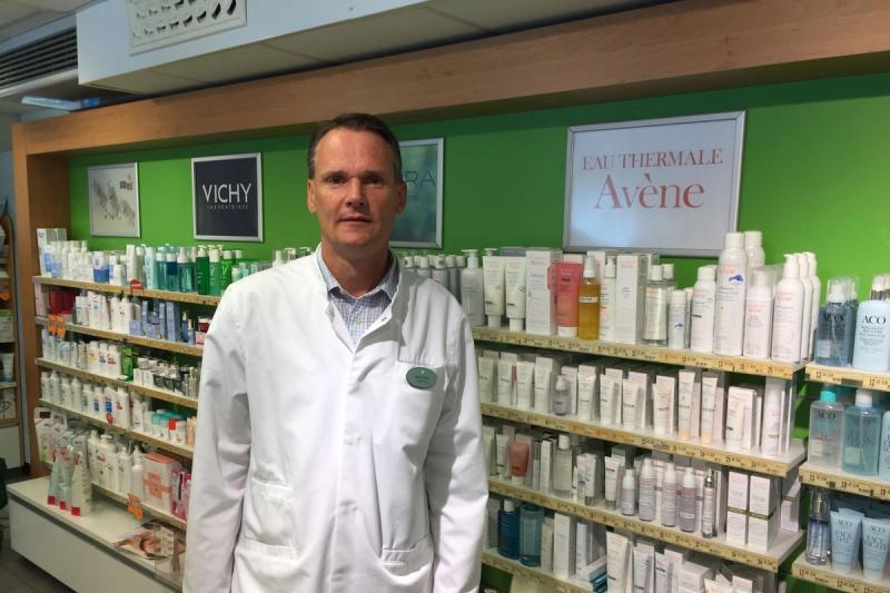 Johan Ek, apotekare vid Central-Apoteket står vid kosmetikhyllan. Foto: Tobias Sjöblom.