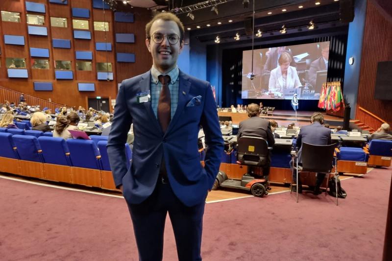 Simon Holmström deltar som en del av den finländska delegationen där han representerar Ålands lagting genom ett stödbrev av talman Bert Häggblom (Ob).