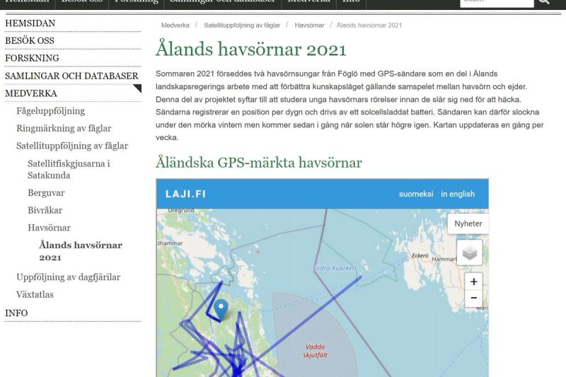 Den 16:e juni 2021 GPS-märktes två havsörnsungar i Föglö skärgård, en hona och en hane. Båda örnarna rörde síg under sommaren runt på Åland, men har under hösten sökt sig över till den svenska sidan där de nu befinner sig, hanen i Uppland och honan i Östergötland. David Abrahamsson är naturvårdsintenden på landskapet.