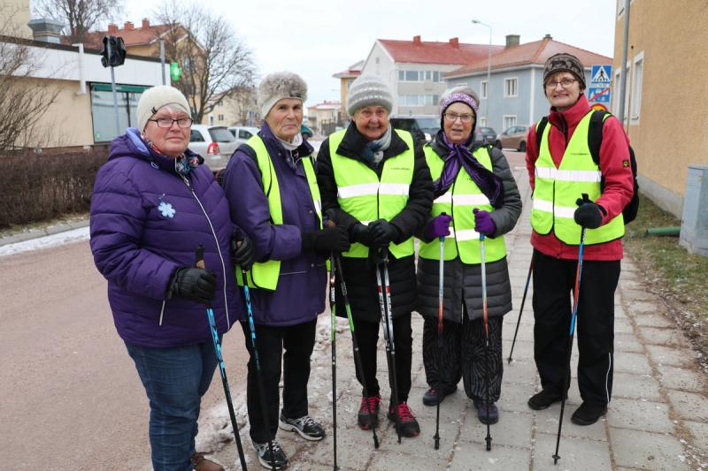 Christina Jansson, Maj Britt Kjellin, Karin Bäckman, Gunvor Backfolk och ledaren Gun Lis Andersson på promenad