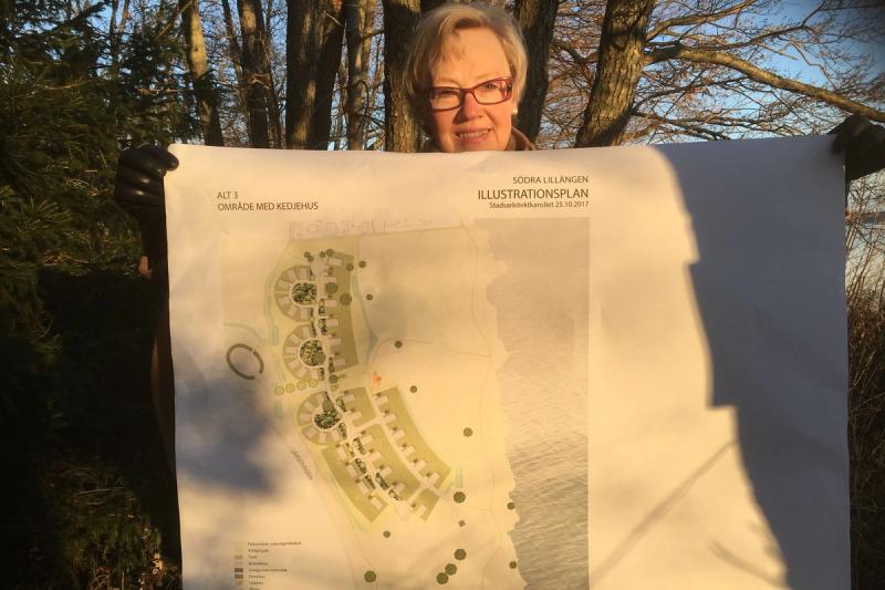 Enligt stadsarkitekt Sirkka Wegelius blir det färre tomter än planerat på grund av naturvärden i området. Här syns hon med illustrationsplanen för bostadsområdet Foto: Eva Ringbom-Fonsell