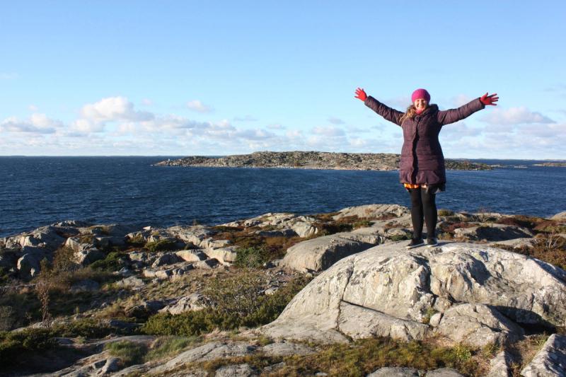 På de röda klipporna vid St:a Anna kyrka på Kökar står Janne Kütimaa. Vinden friskar i och hon ler stort.
