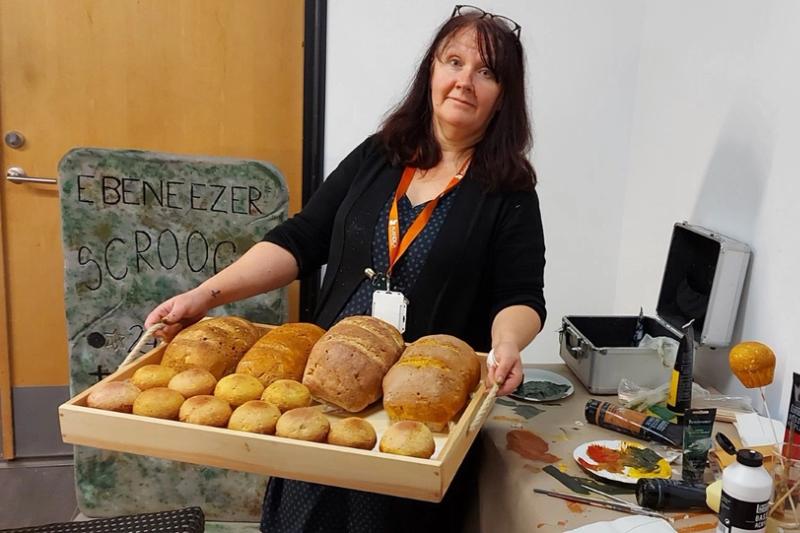 Det gäller också alla de som inte syns på scenen - rekvisitörer, scenbyggare och sömmerskor till exempel, vars uppgift det är att ta hand om det praktiska i föreställingen . Till exempel baka fluffiga bröd av byggskum.