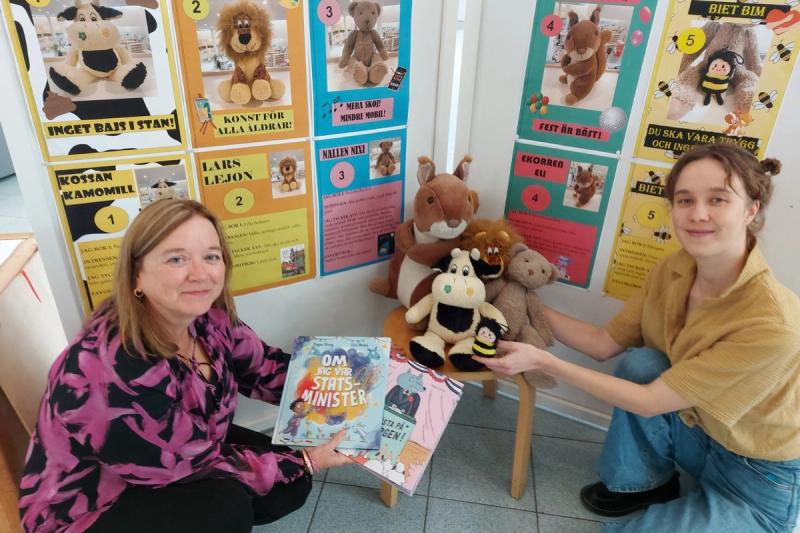 En kossa, ett lejon, en nalle, en ekorre och ett bi ställer upp i kramdjursvalet på Mariehamns stadsblbliotek med egna hjärtefrågor och valaffischer. Idén är lånad från stadsbiblioteket i Jakobstad och passar särskilt bra nu i valtider, säger stadens kultur och fritidschef Fredrika Sundberg.