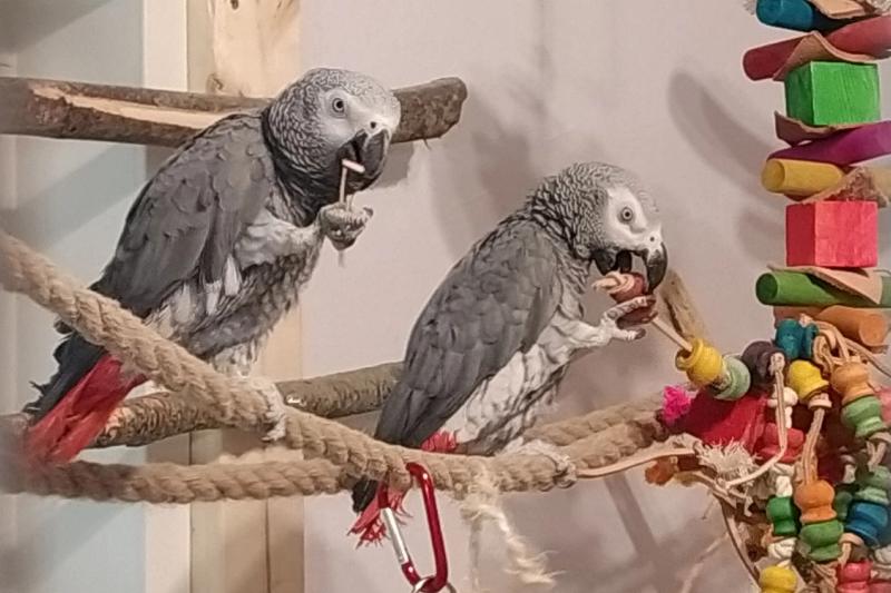 Veckans husdjur heter Malte och Humle och är två stora papegojor av arten Gråjako som bor i eget rum hemma hos Gisela och Fredrik.