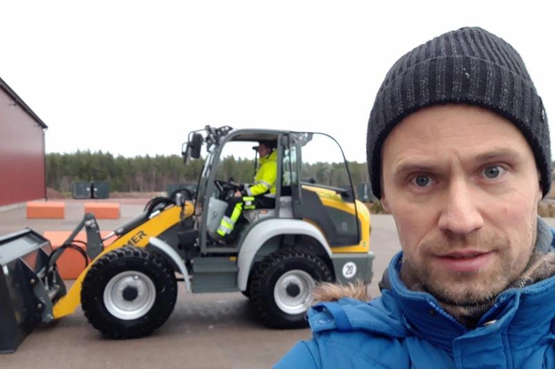 Reportern i förgrunden och elhjullastaren i bakgrunden