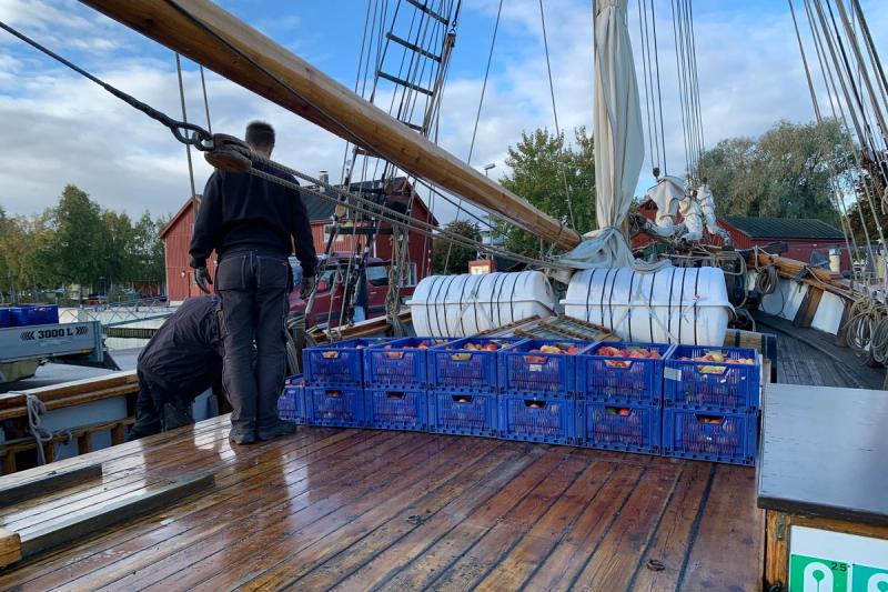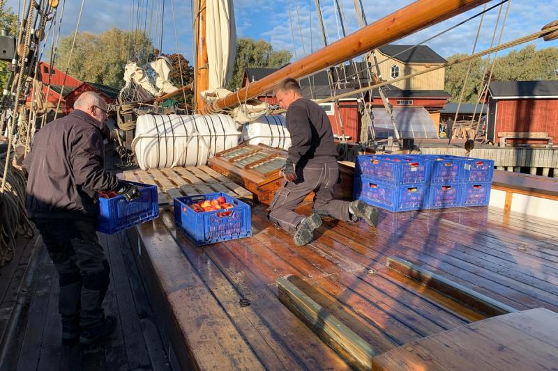 Vi gjorde ett besök vid Albanus igår tisdag då lastningen och provianteringen pågick som bäst och träffade där äppelodlaren Peder Blomsterlund, fartygsansvarige Christian "Kiku" Stenbäck och matansvariga Inger Nygård.