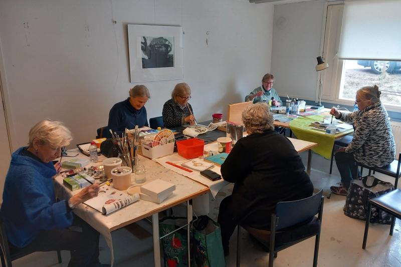 Det är Ålands konstförenings fria målargrupp Måndagsmålarna. Gomorron gav sig dit och träffade föreningens ordförande Regina Santamäki Fischer och och sex glada måndagsmålare.