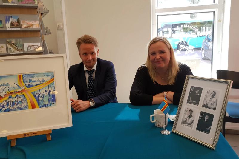 Lantråden är Viveka Eriksson, Camilla Gunell, Katrin Sjögren och Veronica Thörnroos. Åland Post startar också firandet med årets frimärke som visar vägen till självstyrelse, tolkad genom åländske konstnären Jonas Wiléns. Owe Sjöblom pratade med Therese Andersson och Jonas Wilén i Eftermiddag.