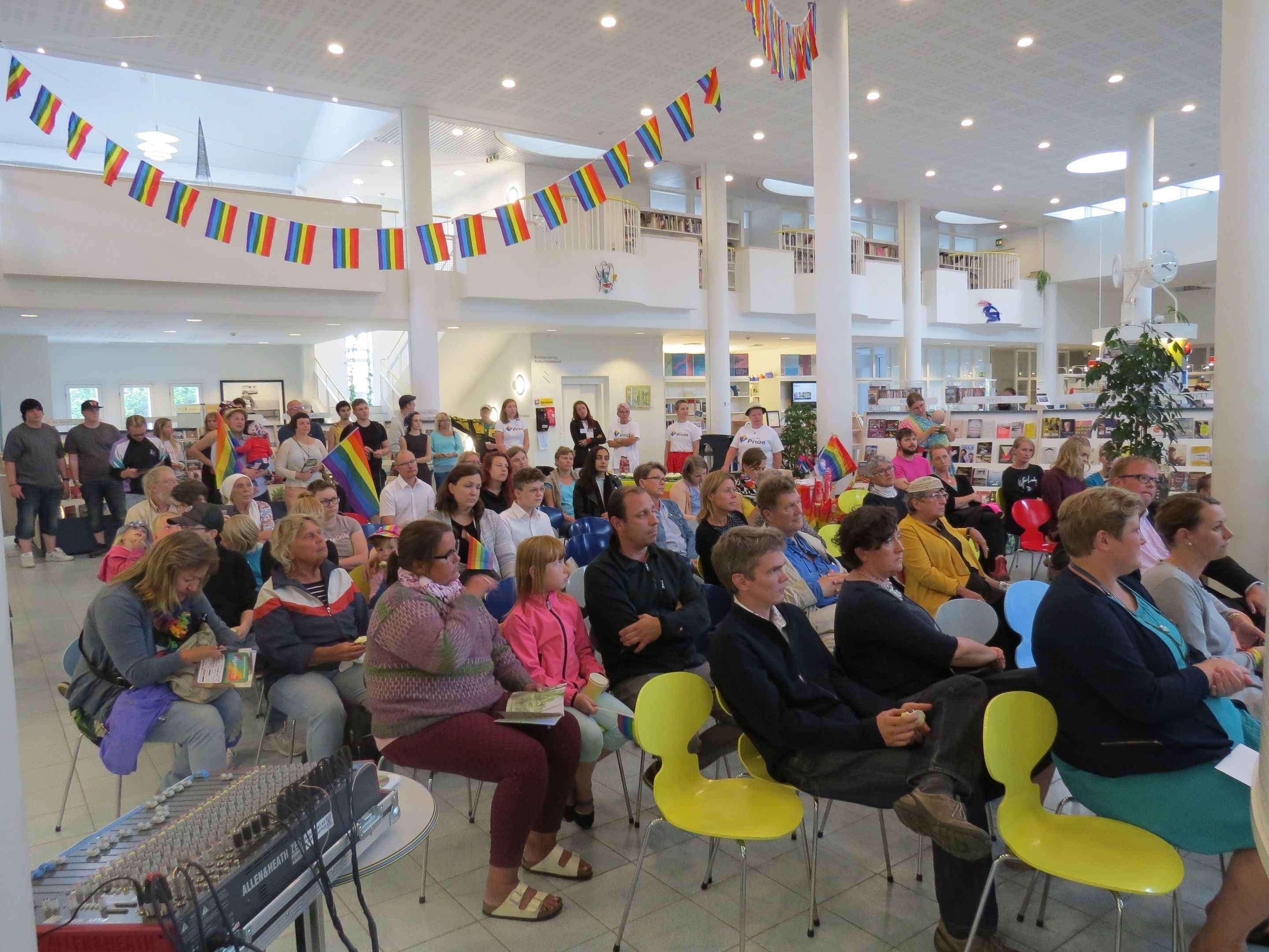 Bild 2 av 2Invigningen av Åland Pride 2017 lockade färglada besökare även om det fanns en hel del tomma stolar i Stadsbiblioteket. Foto: Hasse Persson-Bru.