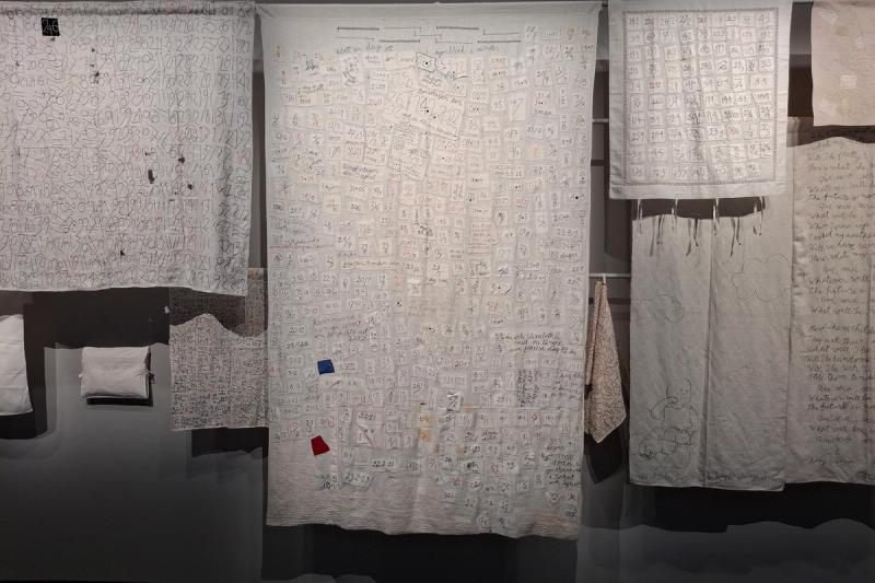 Bakom utställningen står Barbro Xenia Eriksson och utställningen består av hennes broderier där kriget i Ukraina haft ett stort inflytande. Bland annat ett lakan där hon broderat ett datum för varje dag kriget pågått.