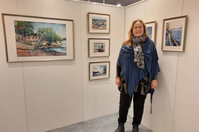 Jaana Gustafsson är först ut med att ställa ut sina akvareller. Hon berättar mer om vattnets betydelse för henne, om utmaningen med att måla vattnets speglingar och om hon någonsin har blivit så frustrerad på ett konstverk att hon knycklat ihop pappret för att börja om på nytt.