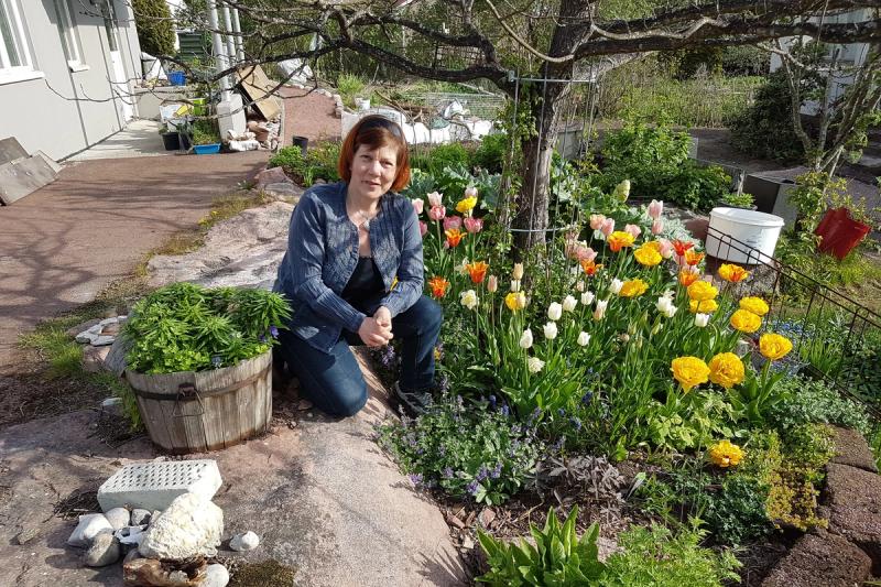 Helen Eriksson ses här med tuplanerna som blomstrade i stadsodlingen i våras. Arkivbild: Ann-Christine Karlsson