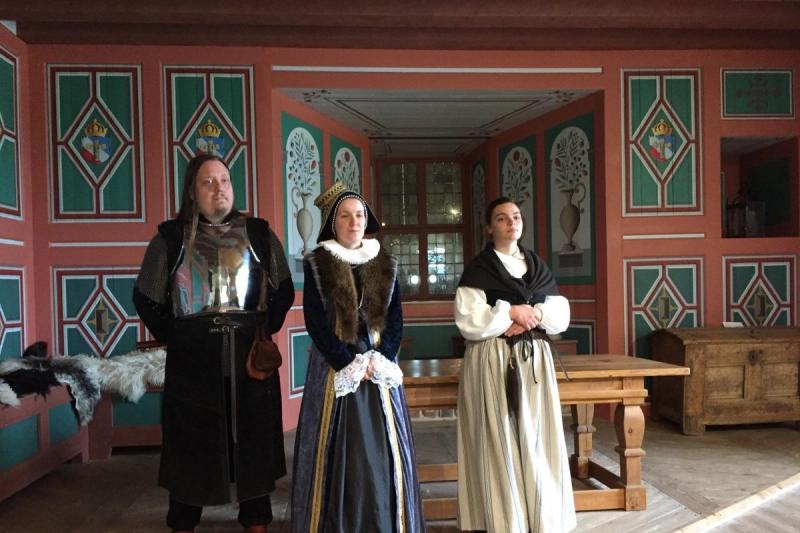 Vi åkte till Kastelholm för att gå en guidad tur på slottet. Guidningarna, som inte kostar något extra för besökare, startade på midsommardagen och kommer att pågå fram till mitten av augusti. Vi träffade intendent Silvana Fagerholm-Sjöblom och dessutom guiderna Peo Berglund, Linnea Andersson och Linnea Sundblom, som berättade om sina kostymer. De guidade turerna på slottet går alla dagar klockan 12 på svenska och klockan 14 på engelska.