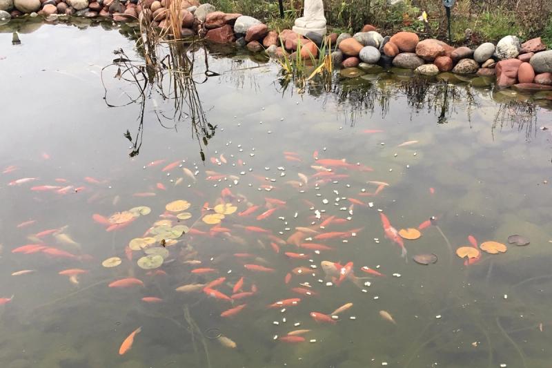 Petra och Paul Erikssons fina fiskdamm på deras gård i Skag är fylld med guldfiskar