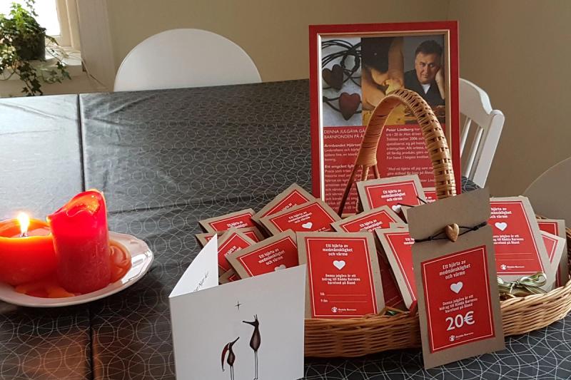 Julkortet och armbandet är en del av Rädda Barnens barnfonds arbete för de som lever i ekonomisk utsatthet. Och som konsument kan man välja om pengarna skall gå till behövande barn på Åland eller i Jemen.