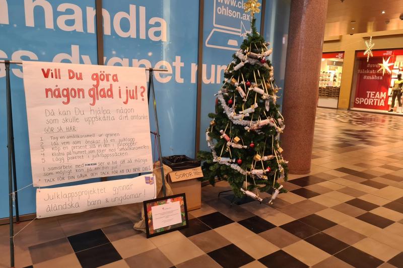 Julgranen med smällkarameller i Maxinges norra del. Foto: Johan Ågren.