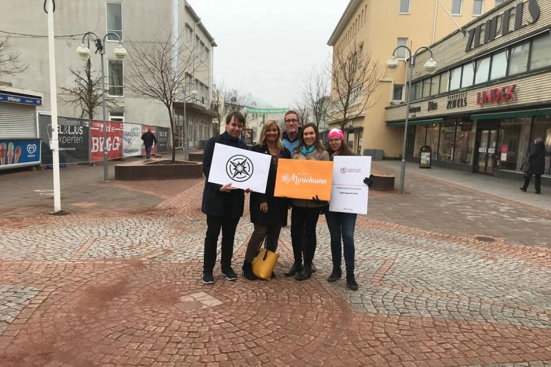 I dag presenterades den nya logotypen genom att centrumgruppen höll presskonferens vid hörnet Torggatan- Ekonomiegatan, där en stor kompassros finns i gatustenarna.