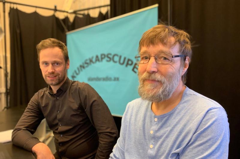 Putte Karlsson, t.h., är Kunskapscupens domare den 13 mars. Här tillsammans med Ålands Radios reporter Hans Persson-Bru. Foto: Josefina Jansson