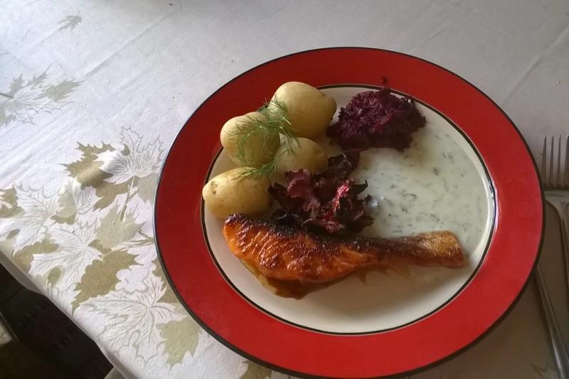 stekt lax och hallonpannacotta