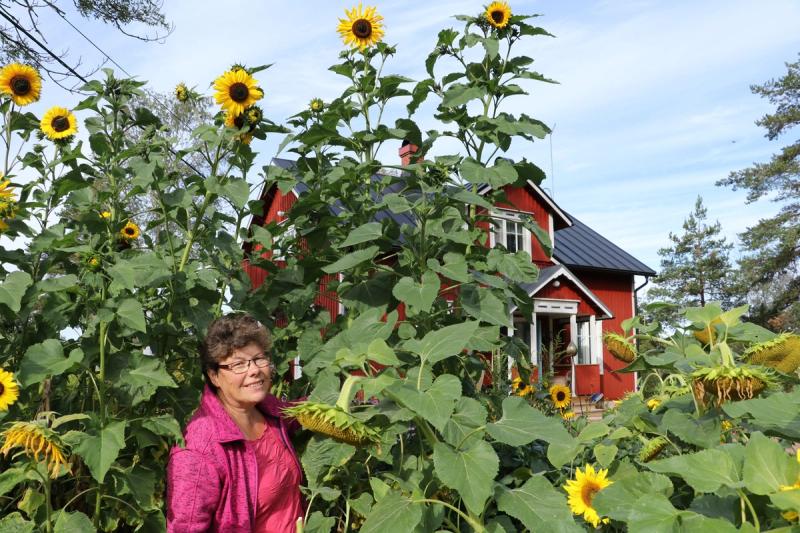 Siv Linney och den 305 centimeter långa solrosen Foto: Kjell Brändström