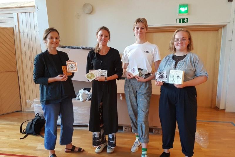 Tanja Reuter-Lindén, som är lektor i bildkonst på Ålands Lyceum, sökte ett "Kultur-i-skolan"-bidrag från Svenska Kulturfonden, och nyligen presenterades resultatet: 10 stycken dubbelvikta vykort i en fin presentask. Utöver Tanja och Johanna, fick vi även en pratstund med de två studerande Ellen Woivalin och Lina Jylhä som har deltagit i kursen.