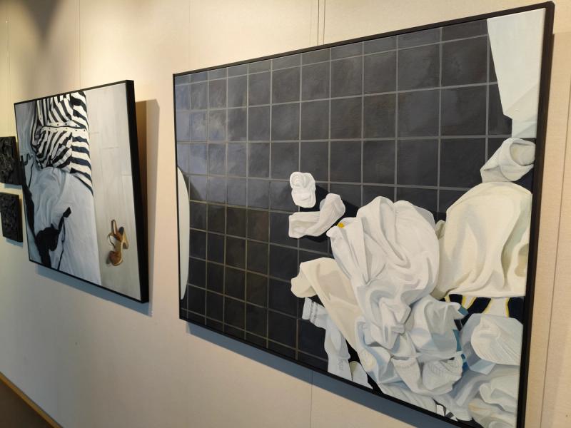 Totalt 17 tavlor ställer hon ut, både abstrakta verk men också realistiska. Den röda tråden som binder verken samman är tvätt.