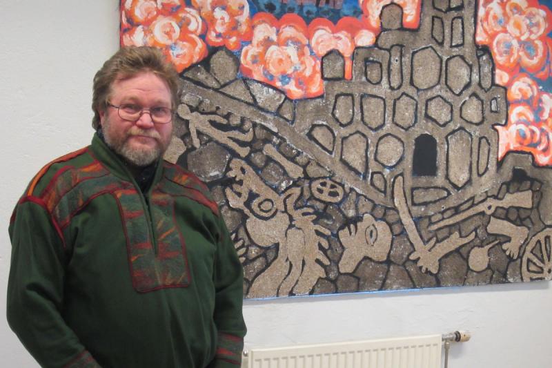 Bild 3 av 4Pekka Antikainen med en målning av slaget om Bomarsund