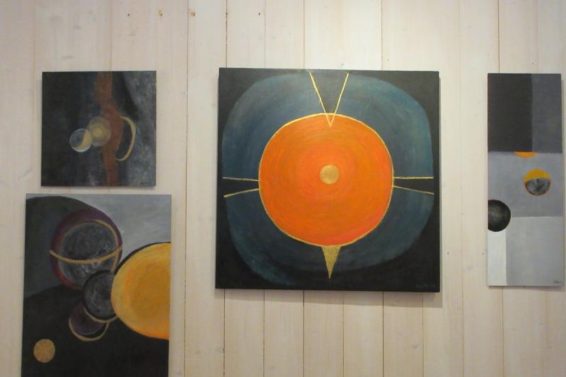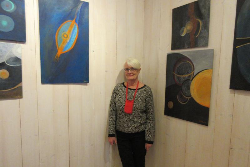 I måndags fyllde Britta Gustafsson 80 år och det firar hon med en tillbakablickande utställning på Lemlands bibliotek. En stor del av utställningen har rymden som tema och visar måleri av ganska färskt datum men här återfinns också alster från åttiotalet.