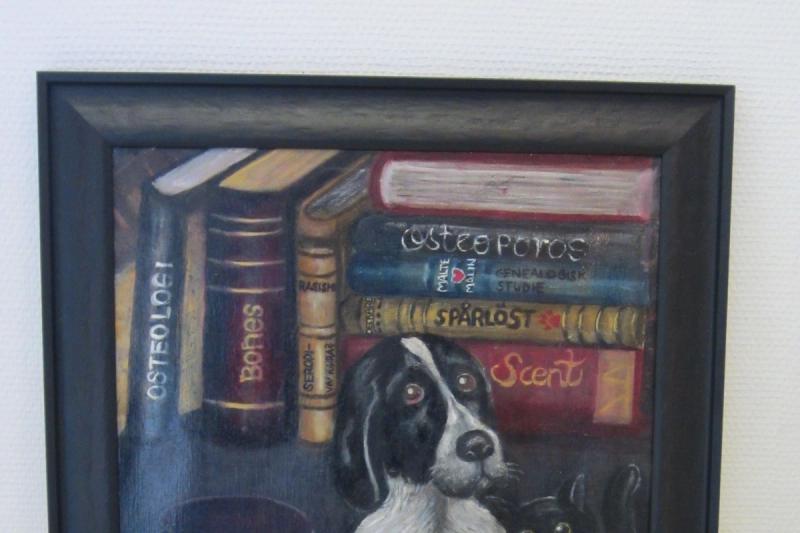 En hund som åker skridsko iförd lång mörk kaftan, en katt utstyrd som Henry VIII, en professorshund med böcker om ben - ja, den nya utställningen på Galleri Fäktargubben är både lekfull och tankeväckande. Här finns nämligen också en målning med titeln Syrisk frukost, bomber och granater, en konstnärlig kommentar till kriget som historisk företeelse och mänsklig verklighet. Konstnären bakom oljemålningarna heter Amppi Darmark, känd inte minst för sina fina illustrationer och kartor till åtskilliga utställningar på Ålands museum genom åren men också som frimärkesformgivare. Någon konstnärlig utbildning har Amppi Darmark egentligen inte, hon är ursprungligen arkeolog. Mitt viktigaste verktyg är ögat, man måste ta sig tid att studera det man vill måla grundligt, sen är det bara att göra säger hon. Redaktör är Eva Nyberg