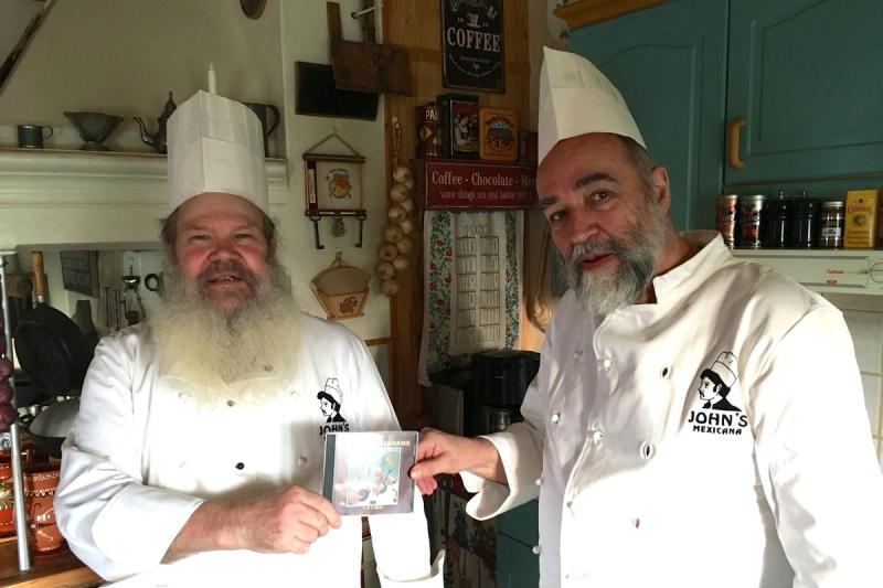 John Stenbäck heter han egentligen, bor i Önningeby och det är han som har skrivit texterna. Tillsammans med Stäni Steinbock som har gjort musik och inspelning presenterade han skivan för pressen med plättar och sång.