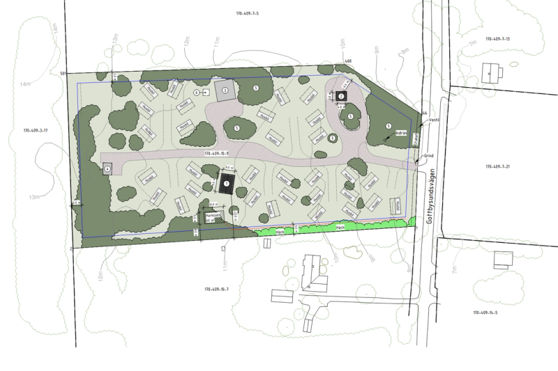 Utöver ställplatserna planeras en servicebyggnad på 54 kvadratmeter och ett sophus och en bastubyggnad på 15 kvadratmeter vardera på området.