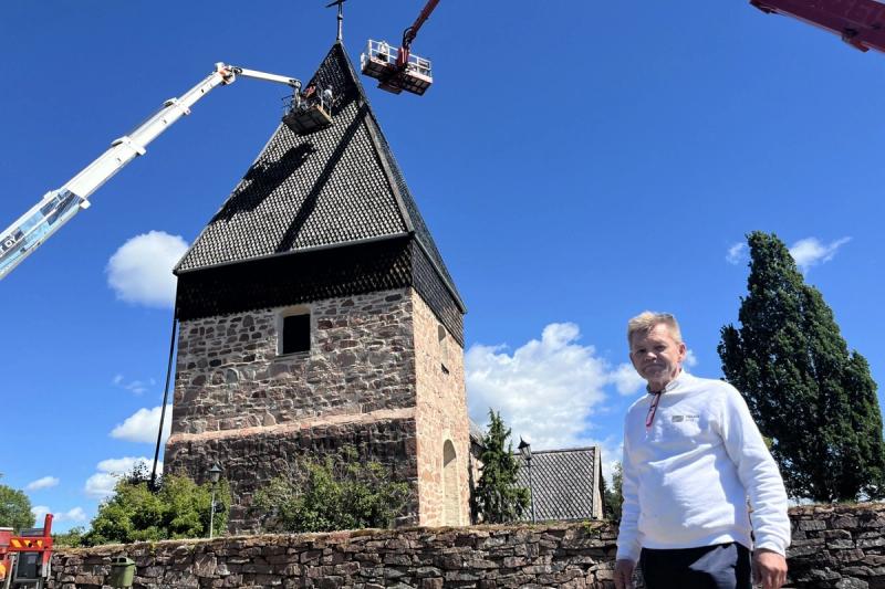 Eckerö kyrka är en av de 320 kyrkor i Finland som med jämna mellanrum behöver tjära taket för att det inte ska ruttna. För en vecka sedan inleddes arbetet med att Mika Grönblad tillsammans med sina fyra kollegor satte igång med spåntakstjärningen.