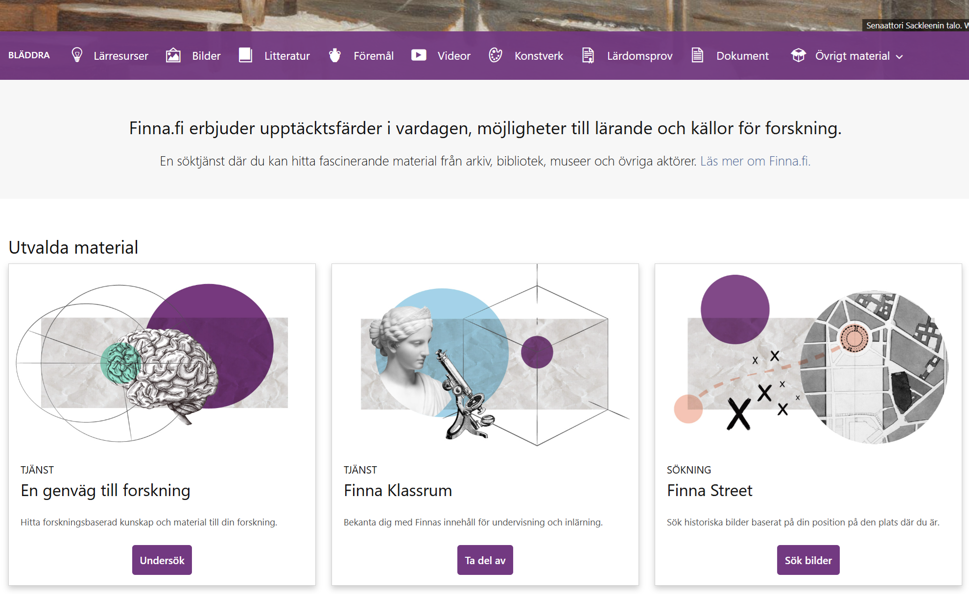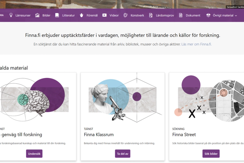 Finna fungerar som en gemensam webbportal för material från museer, bibliotek och arkiv i Finland.