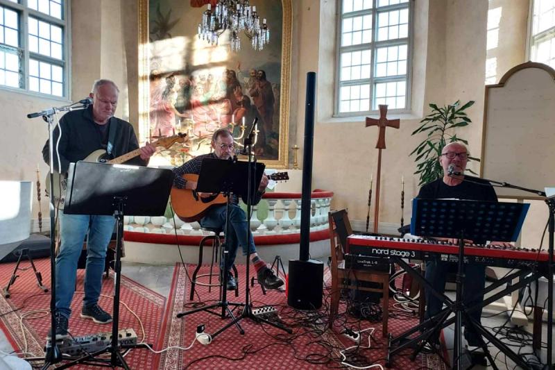 Det är Ulf Weman och bröderna Elof och Guy Karlsson som på fredagskvällen välkomnar publiken till Lemlands kyrka och sånger och musik till tröst.