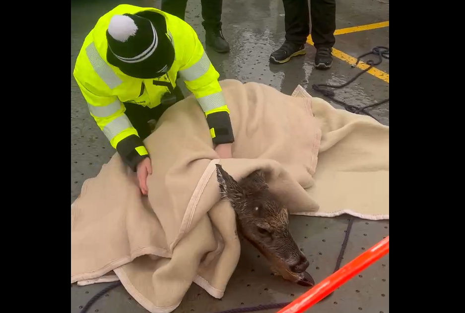 Under torsdagen räddade besättningen på M/S Knipan en vitsvanshjort som gått ner sig i isrännan mellan Åva och Osnäs.