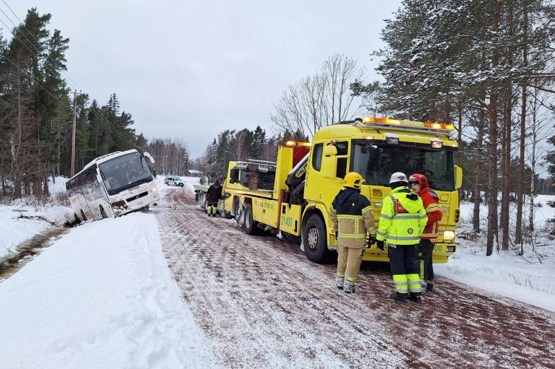 En buss körde vid 8-tiden på fredag morgon i diket på Jomalabyväg vid gamla Naturbruksskolan. I bussen befann sig 26 personer.