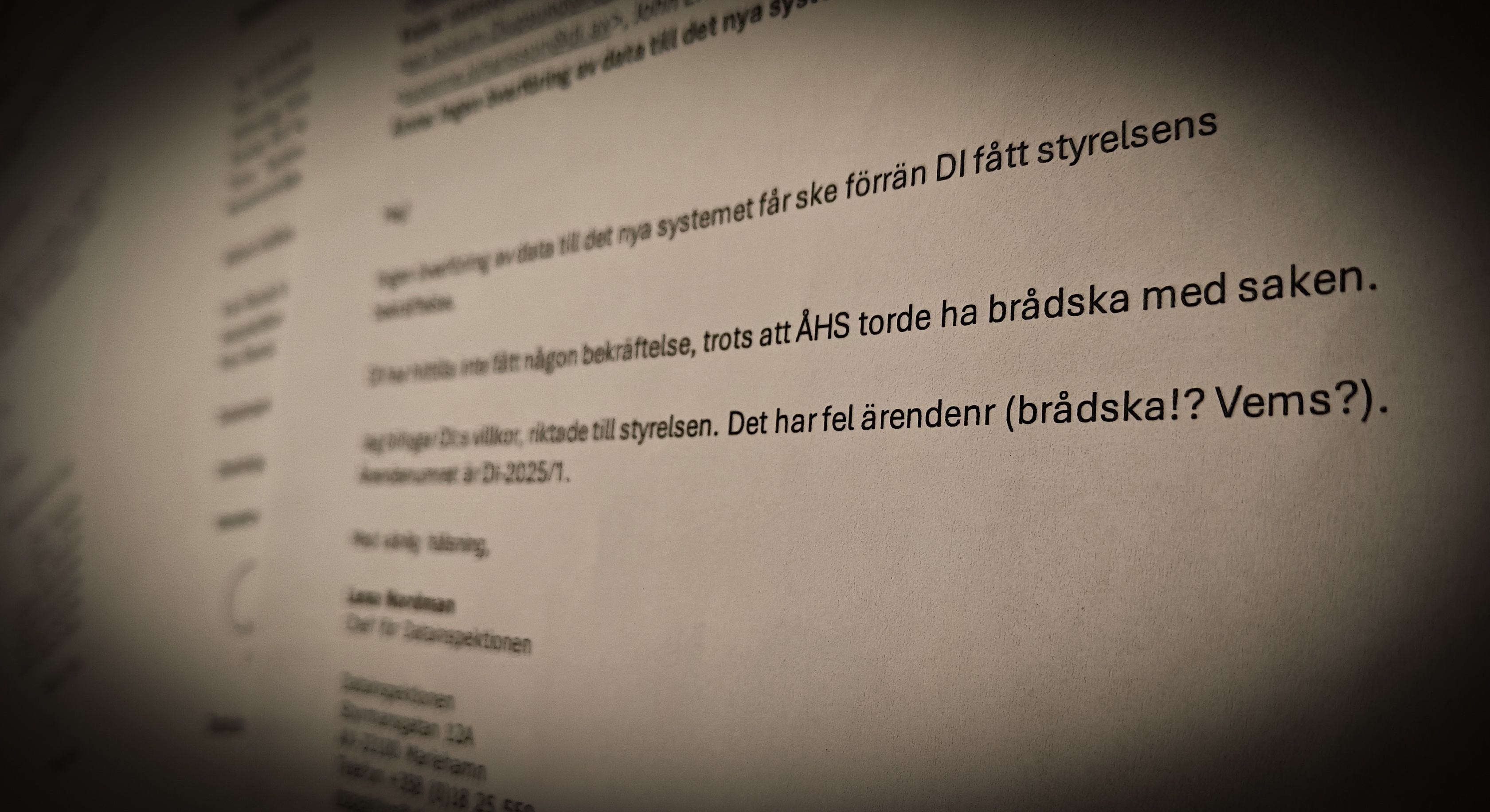 “Jag bifogar DI:s villkor, riktade till styrelsen. Det har fel ärendenr (brådska!? Vems?)" (12.9.2025)