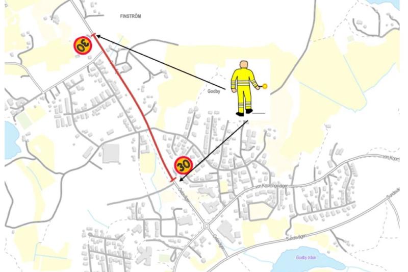 Hastighetsbegränsningen sänks till 30 kilometer i timmen i arbetsområdet och trafikvakter leder trafiken. Landskapet uppmanar trafikanterna att köra försiktigt och att vara ute i god tid då trafikreglering kan leda till förseningar.