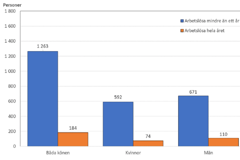 Enligt uppgifter från arbets- och näringsministeriet hade 74 kvinnor och 110 män, sammanlagt 184 personer, varit arbetslösa hela året.
