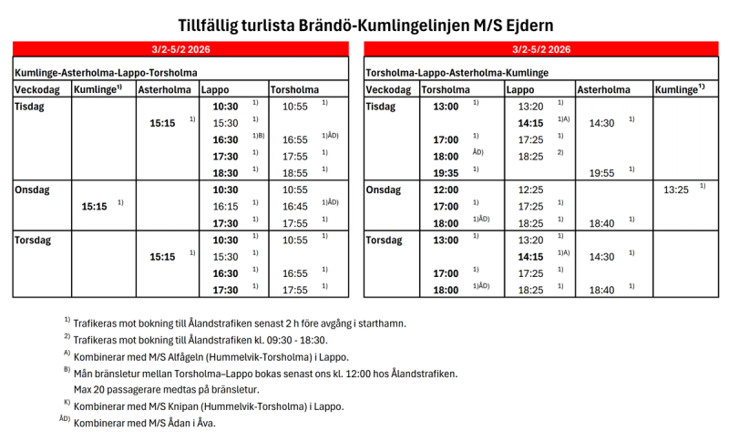 I stället är det M/S Ejdern som sköter trafiken på linjen och fartyget trafikerar med en tillfällig turlista, som innebär att morgonturen och kvällsturerna ställs in.