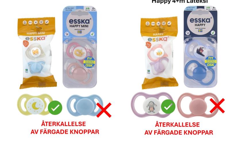 Återkallelsen gäller napparna Happy 4+m i silikon och latex med färgad knopp samt nappen Happy mini 0+m med färgad knopp.