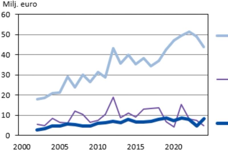 Värdet av de sålda bostadsfastigheterna minskade med fem miljoner till 44 miljoner euro. Områden för fritidsbebyggelse ökade däremot med närmare fyra miljoner till åtta miljoner euro. Jord- och skogsbruksområden såldes för 3,5 miljoner och fastigheter med övriga användningsändamål för 1,5 miljoner.