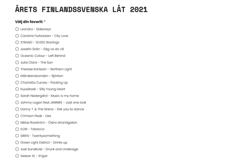 För fjärde året i rad har Ålands Radio tillsammans med Radio Vaasa, Yle Vega och Yle X3M nominerat låtar till omröstningen.