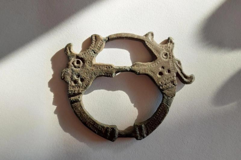 Fornfyndet är en bältessölja prydd av två drakhuvuden.