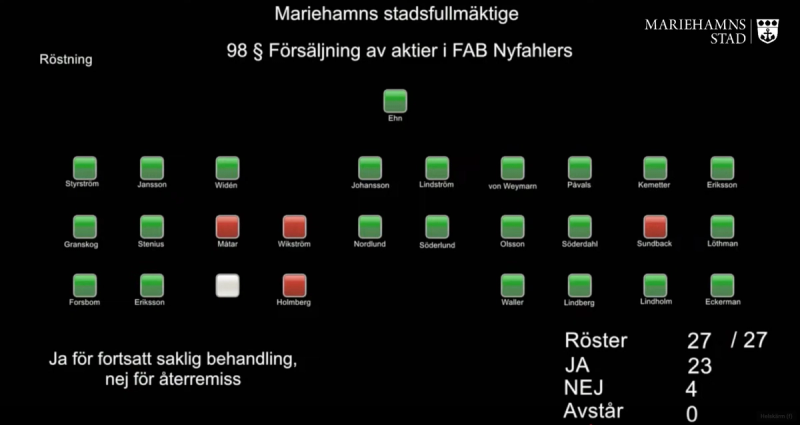 Barbro Sundback (S) föreslog att ärendet skulle återremitteras för förnyad beredning som “följer relevant lagstiftning och som resulterar i ett pris som är i enlighet med den värdering som gjorts inför försäljningen”. Obunden samlings Marcus Måtar, Christian Wikström och Mats Holmberg röstade med Barbro Sundback, övriga 23 ledamöter i salen röstade för fortsatt behandling.