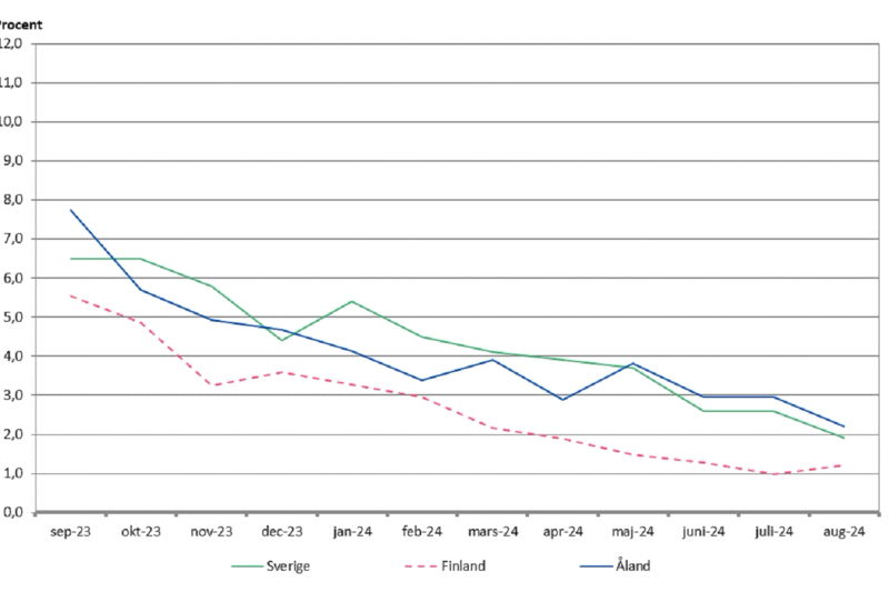 I riket var inflationstakten 1,2 procent i augusti 2024 jämfört med augusti 2023 och i Sverige var den 1,9 procent. Precis som på Åland sjönk konsumentpriserna från juli till augusti i år, med 0,5 procent i riket och 0,6 procent i Sverige.