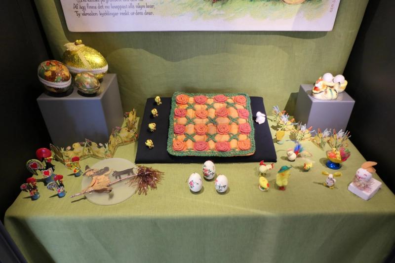 I en temautställning i museientrén kan man fram till påsk bekanta sig med påskpynt och lokala påsktraditioner.