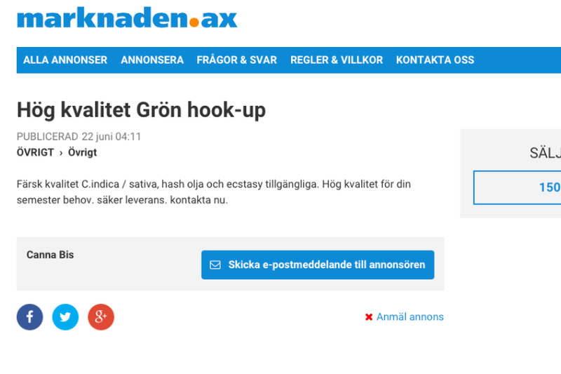 Ålandstidningen ändrar reglerna för annonsering på marknaden.ax efter att en annons om droger infördes tidigt i morse. Hög kvalitet Grön ”hook-up” löd rubriken för annonsen som erbjöd cannabis och Ecstasy.