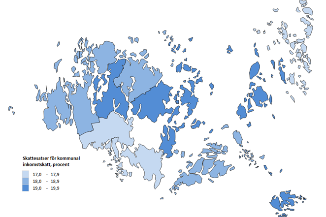 Inkomstskattesatsen är i genomsnitt 17,7 procent på Åland. Mariehamn har den lägsta skattesatsen med 17 procent och Kökar har den högsta på 19,7 procent.